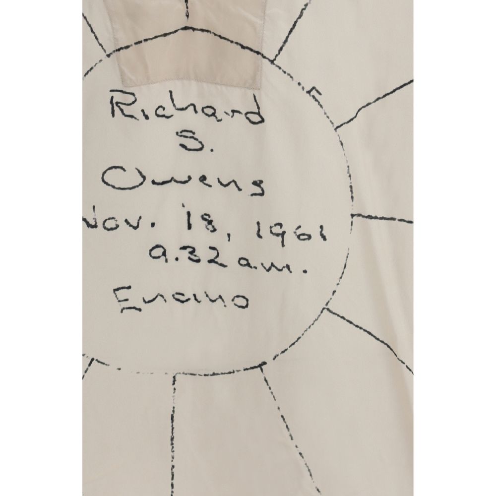 The Cropped Flightsuit Top, below hip length at the front and slightly longer at the back with side slits and a V neck, by Rick Owens features a centered print reproducing the designer’s astrological natal chart. The motif is an exact copy of the hand-drawn chart created by his father John on the day of his birth in 1961, positioned so that the circle sits prominently on the front. The essential construction and asymmetric length enhance the silhouette with bold balance, making this Cropped Flightsuit Top by Rick Owens a conceptual piece rich in symbolic meaning.