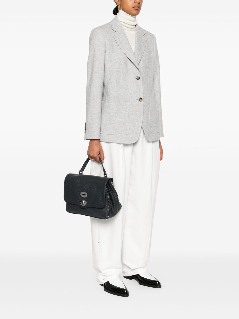 navy blue leather pebbled texture foldover top twist-lock fastening single flat top handle adjustable shoulder strap silver-tone stud detailing metal feet partitioned compartment internal zip-fastening pocket internal patch pocket internal logo stamp internal card slot full lining Postina Daily small leather handbag
